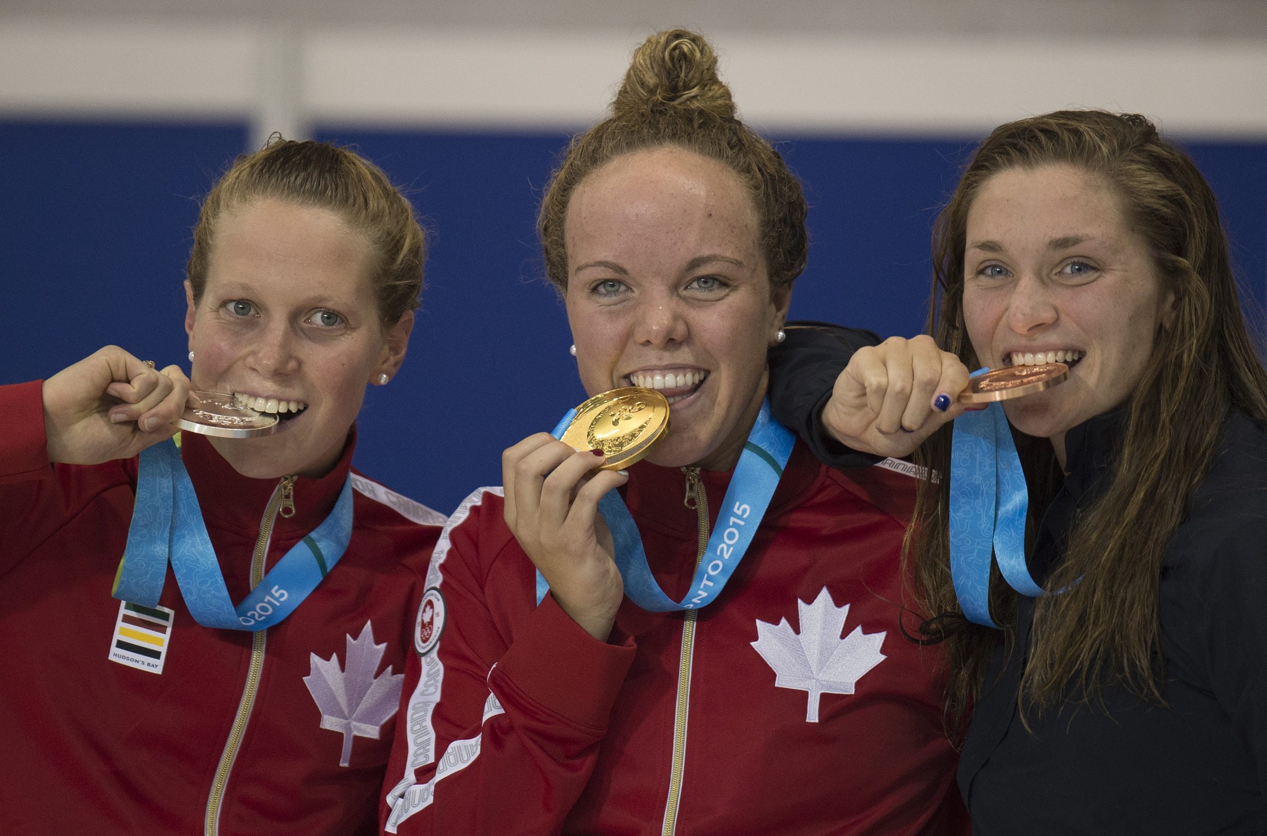 Martha McCabe (left) winning silver in the Women’s 200M Breaststroke finals at the 2015 Pan American Games in Toronto, Canada. (JIM WATSON/AFP/Getty)