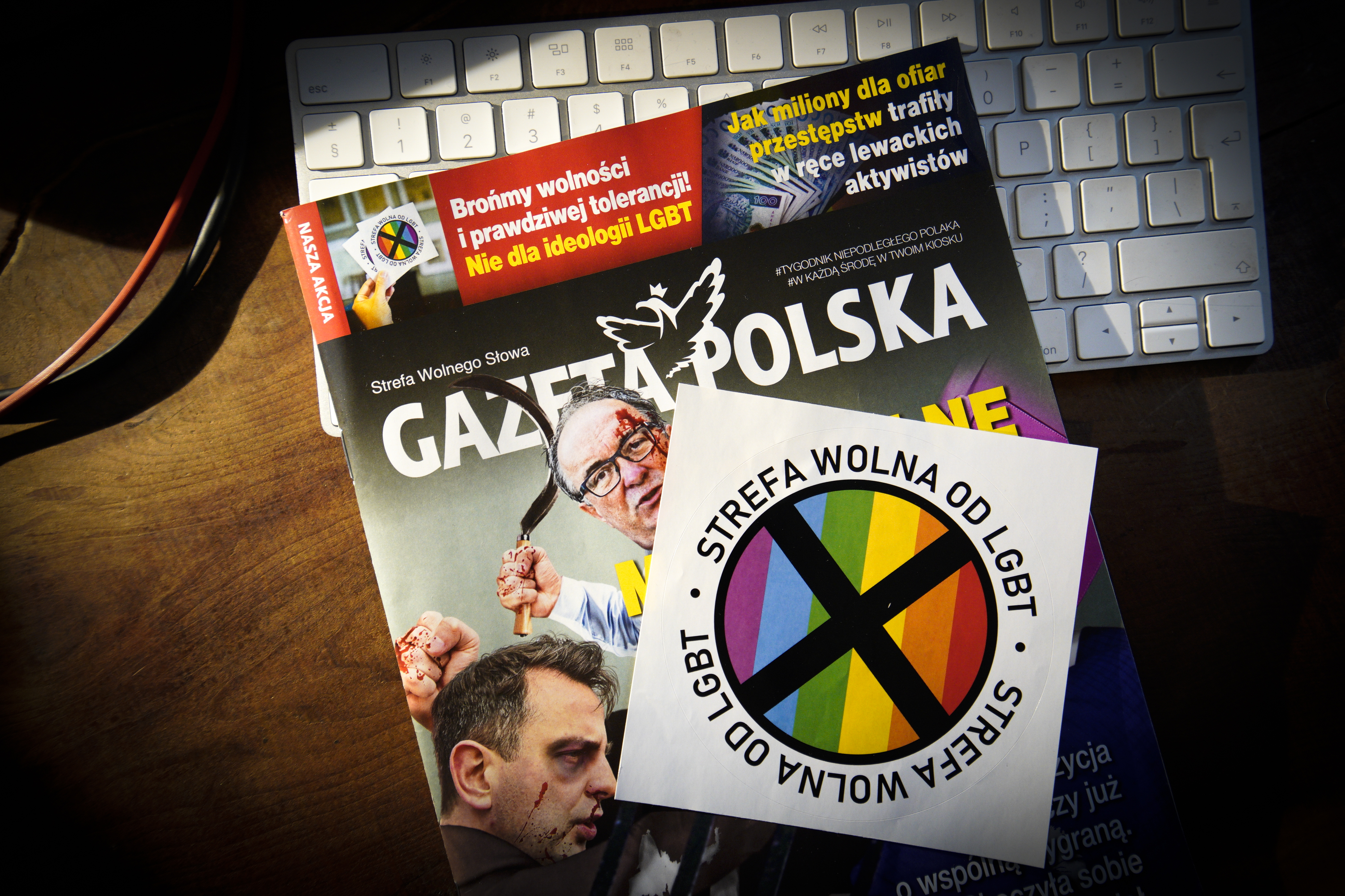 ‘LGBT-free zone’ stickers for shops and businesses distributed in the conservative Polish Gazeta Polska magazine (Jaap Arriens/NurPhoto/Getty)