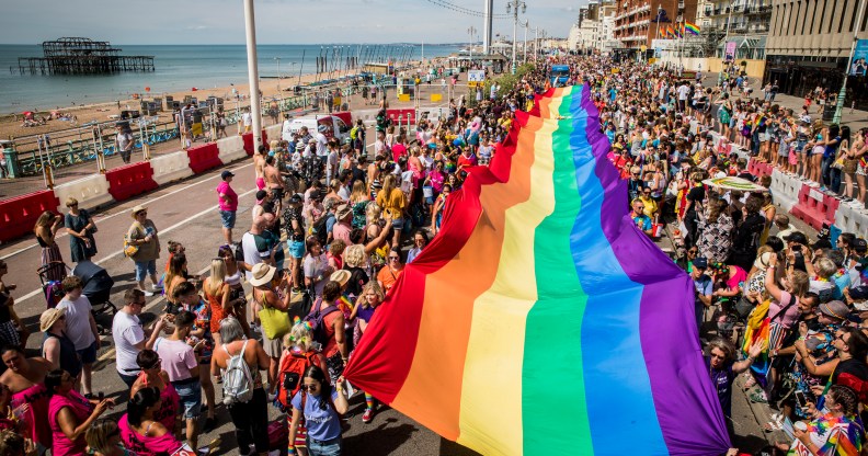 A giant rainbow Pride flag is carried along the sea front during Brighton Pride 2018 on August 4, 2018 in Brighton, England. (Tristan Fewings/Getty)