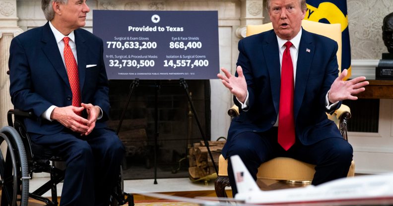 Texas Governor Greg Abbott meets Donald Trump at the White House in May 2020. (Doug Mills-Pool/Getty Images)