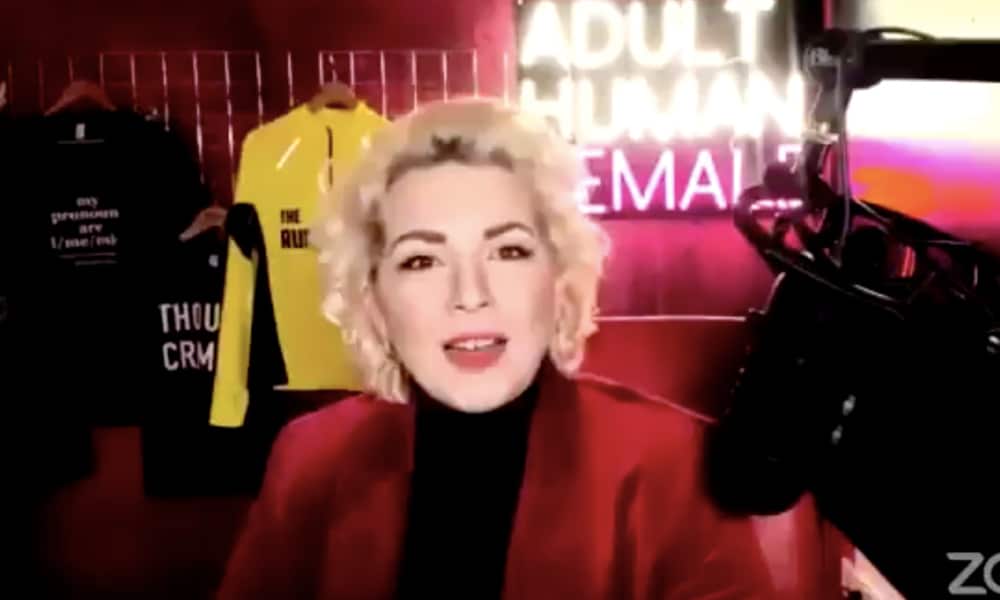 Posie Parker, a “gender critical” campaigner who came up with the slogan “woman=adult human female”. (Screen capture via Twitter)