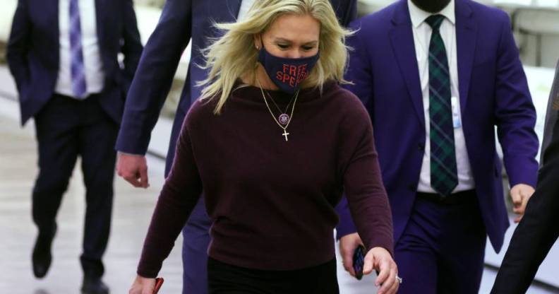 US Rep Marjorie Taylor Greene (R-GA) leaves her office at Longworth House Office Building for a vote in the House chamber 4 February 2021 on Capitol Hill in Washington, DC. The House voted later that day on removing Greene from committee assignments over her remarks about QAnon and other conspiracy theories. (Photo by Alex Wong/Getty Images)
