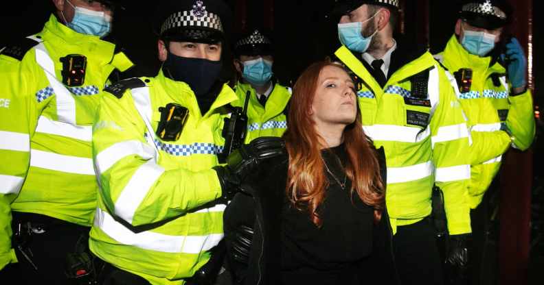 Patsy Stevenson is detained by Met police at a peaceful vigil for Sarah Everard on Clapham Common (Kristian Buus/In Pictures/ Getty)