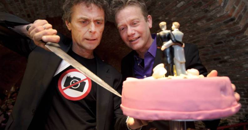 Jan van Breda (L) and his partner Thijs Timmermans cut the cake after their wedding, on 1 April 2011 in Amsterdam. (Photo credit should read EVERT ELZINGA/AFP via Getty Images)