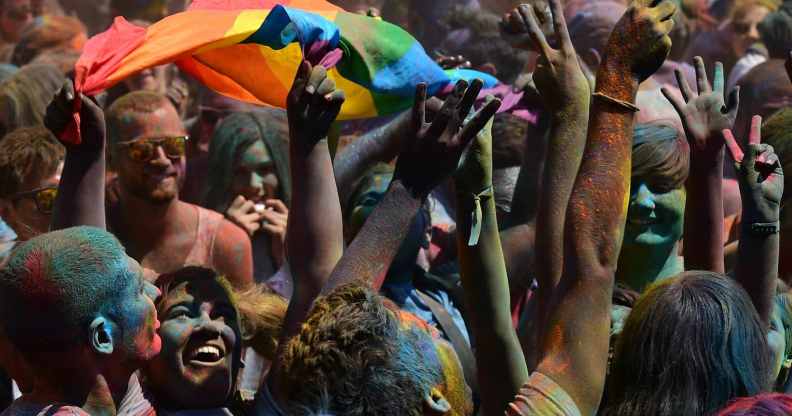 A Pride flag is seen at The Hindu festival of Holi. (AFP via Getty/ LLUIS GENE)