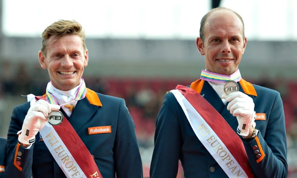Hans Peter Minderhoud and Edward Gal pose with their Silver medals at the 2013 FEI Dressage European Championships in Denmark (Henning Bagger/AFP/Getty)