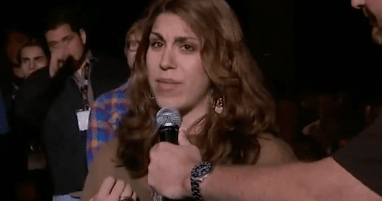 She’s met with jeers from the crowd.