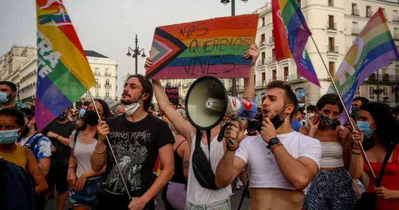 Protesters rally against anti-LGBT+ violence in Puerta del Sol, Madrid after the killing of Samuel Luiz. (Getty)