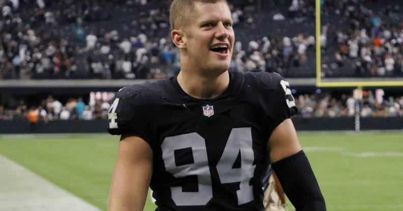 Carl Nassib of the Las Vegas Raiders celebrates as he walks off the field after the team’s victory over the Miami Dolphins on 26 September 2021 in Las Vegas, Nevada. (Getty/Ethan Miller)