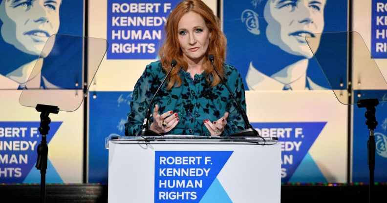 JK Rowling speaking on stage at the Robert F Kennedy Ripple of Hope Awards. (Dia Dipasupil/Getty)