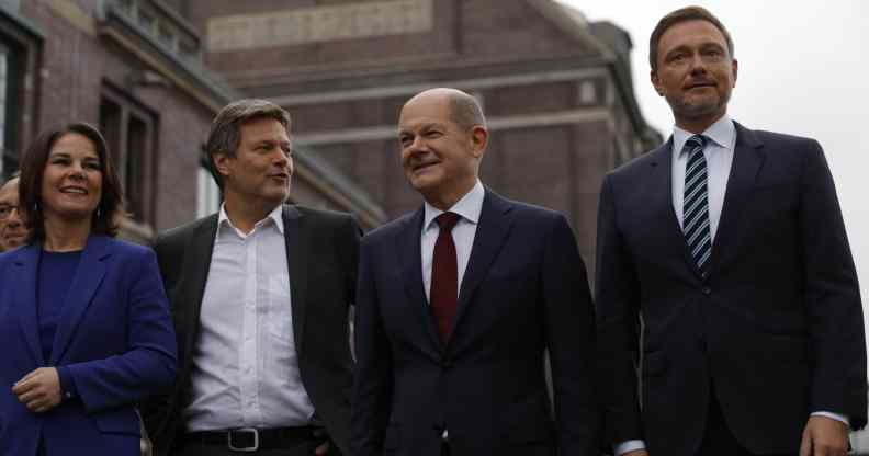 The three party alliance set to lead Germany, made up of SPD chancellor-elect Olaf Scholz, FDP leader Christian Lindner, and Annalene Baerbock and Robert Habeck, co-leaders of the Greens Party. (Getty/ Michele Tantussi)