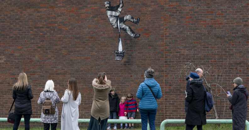 Members of the public take pictures of art work by graffiti artist Banksy on the side of HMP Reading depicting a prisoner escaping with a typewriter, an acknowledgement to one of the former prisoners Oscar Wilde (Photo by Ming Yeung/Getty Images)
