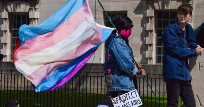 A protester holds a trans pride flag and a placard that reads “Protect Trans Kids” placard during the trans rights demonstration. (Vuk Valcic/SOPA Images/LightRocket via Getty)