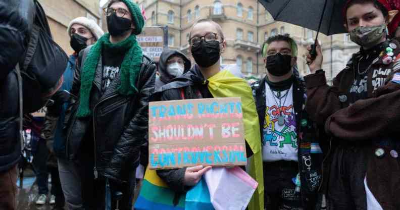 A protestor seen holding a placard that says ‘Trans rights shouldn’t be controversial’ during a demonstration. (Belinda Jiao/SOPA Images/LightRocket via Getty)