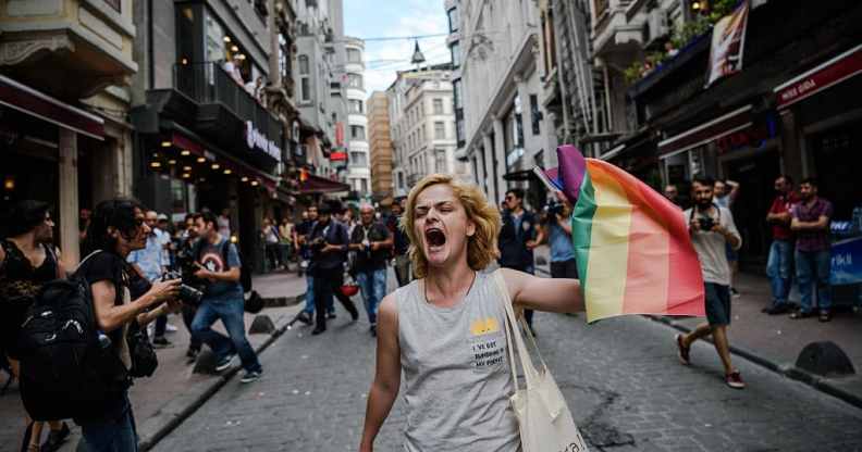 A protester waves a rainbow flag during a protest rally staged by the LGBT+ community in Istanbul in 2016 (Getty)