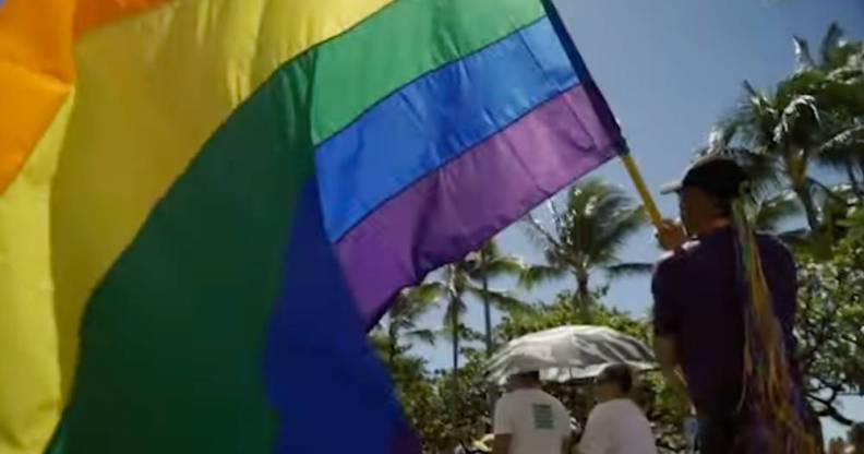 A person holds an LGBT+ flag as they participate in a march celebrating Honolulu Pride Month in Hawaii. (YouTube/KHON2 News)