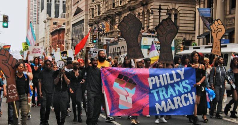 Trans people and allies rally in Philadelphia, Pennsylvania in 2018 before marching to demand basic human and civil rights. (Cory Clark/NurPhoto via Getty)