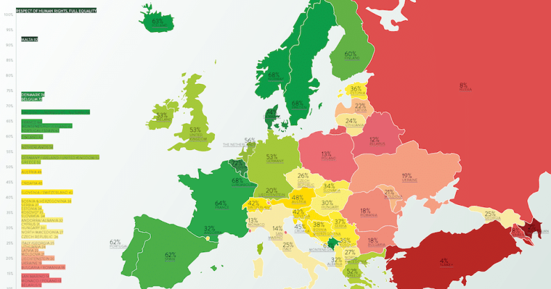 The worst countries for LGBTQ+ people were Azerbaijan, with just two per cent, Turkey with four per cent, and Armenia with eight per cent. The three countries have retained the bottom three places for the past two years.