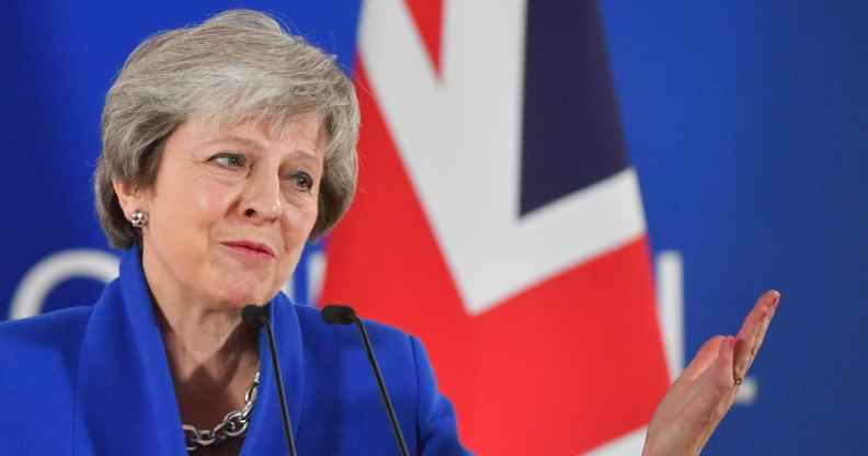 Theresa May was the first prime minister to promise to ban conversion therapy. (Credit: EMMANUEL DUNAND/AFP via Getty Images)