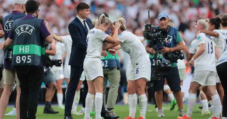 England celebrates winning after the UEFA Women’s European Championship match between England and Germany. (Pat Scaasi/ MI News/NurPhoto via Getty)