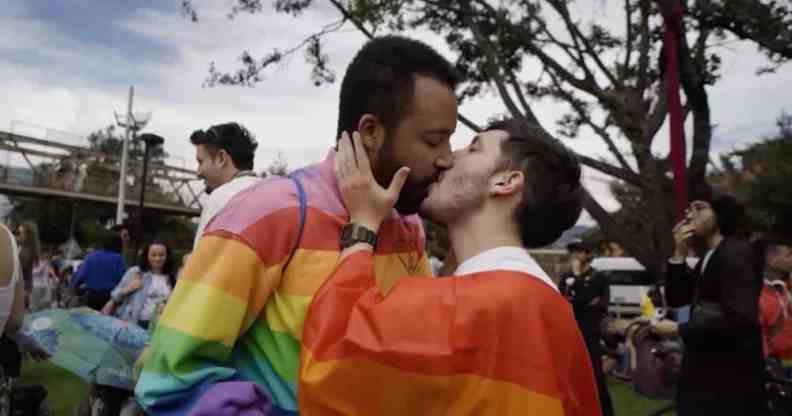 Hundreds of LGBTQ+ Colombians stage moving ‘kiss-a-thon’ after bigoted mob threatens gay couple