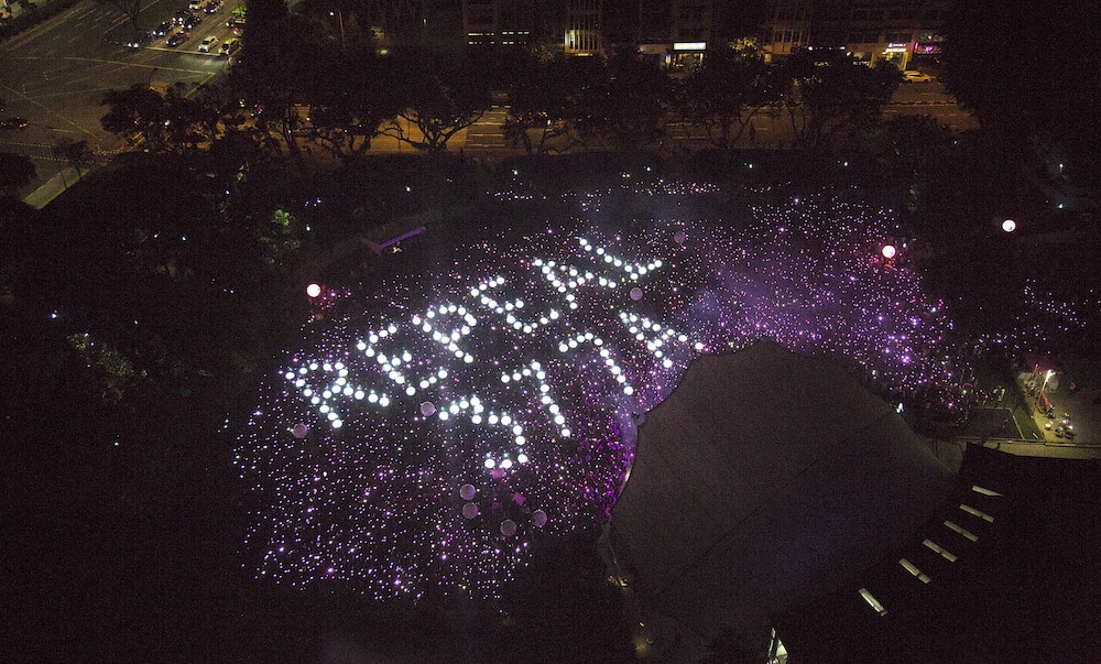 Attendees form the words ‘Repeal 377A’ in lights at the Pink Dot event, 2019. (Getty/ Ore Huiying)