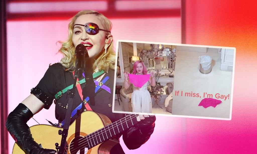 In the video, Madonna stands in front of a bin with a pair of neon pink pants in her hand. The caption reads: “If I miss, I’m Gay!” The superstar then – seemingly deliberately – misses the bin before throwing her hands up and walking away.