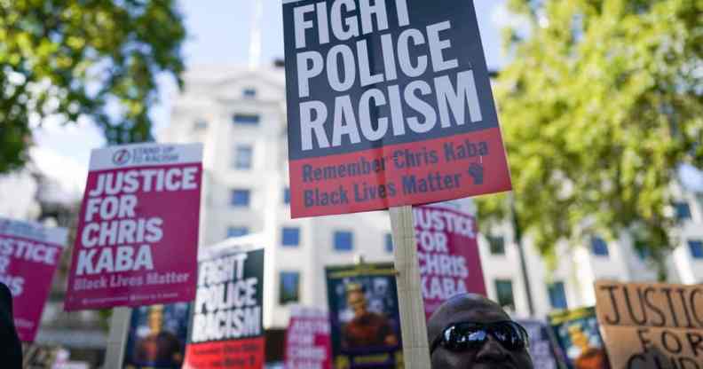 Demonstrators gather outside New Scotland Yard in London during a protest over the killing of Chris Kaba by the Met Police. (Photo by Ian Forsyth/Getty Images)