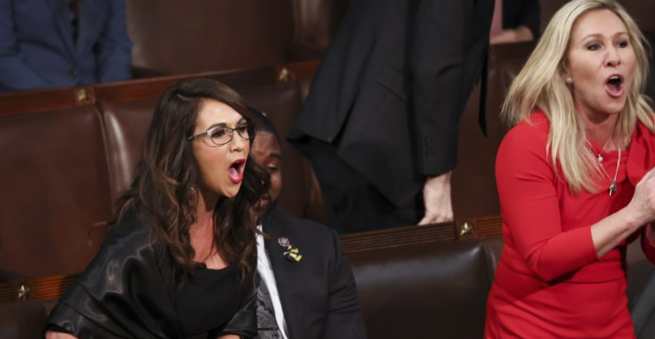 Lauren Boebert and Marjorie Taylor Greene scream “Build the Wall” as US President Joe Biden delivers the State of the Union address during a joint session of Congress in the U.S. Capitol’s House Chamber. (Photo by Evelyn Hockstein-Pool/Getty Images)