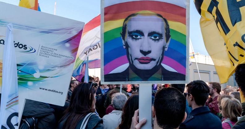A protestor holds up a routinely seen 'gay clown' poster of Vladimir Putin. (Getty)