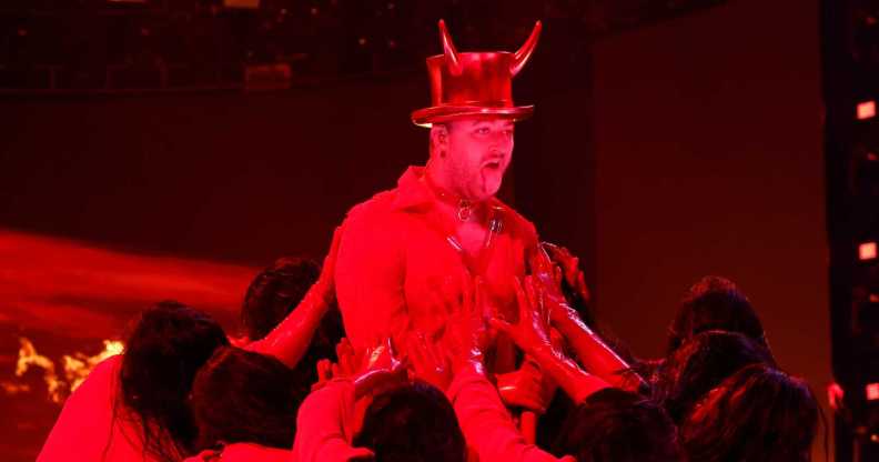 Petras was then seen singing in a cage as several dominatrices in red latex clambered over the set, including Drag Race icons Violet Chachki and Gottmik. The entire gag-worthy performance was accompanied by pyrotechnics and demonic red lighting.