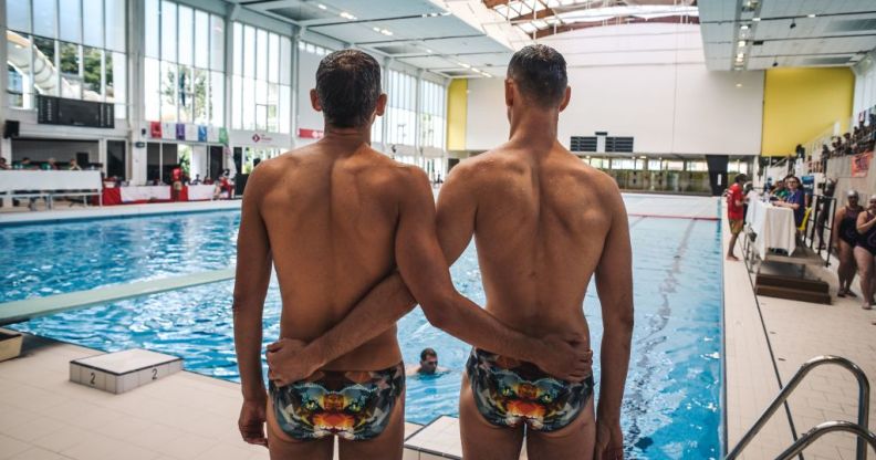 Two men wait for the results of their dive at the 2018 Gay Games. (LUCAS BARIOULET/Getty)