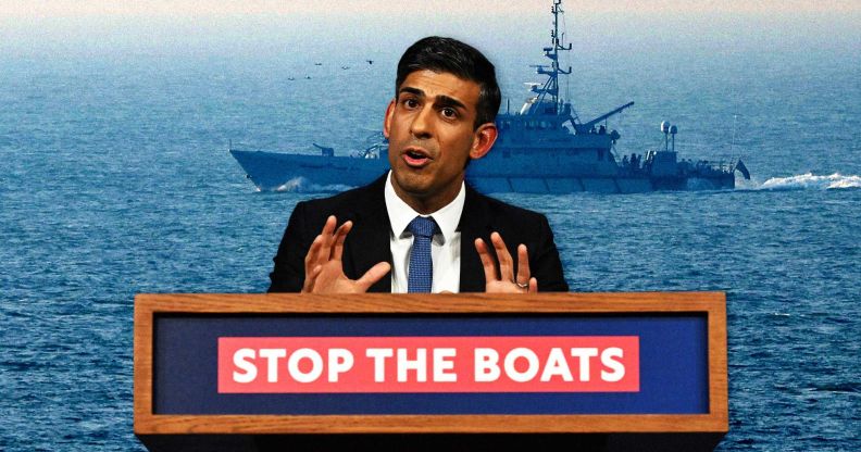 Prime minister Rishi Sunak's anti-asylum plan has been fiercely condemned by LGBTQ+ and refugee activists alike. (Getty/PinkNews)