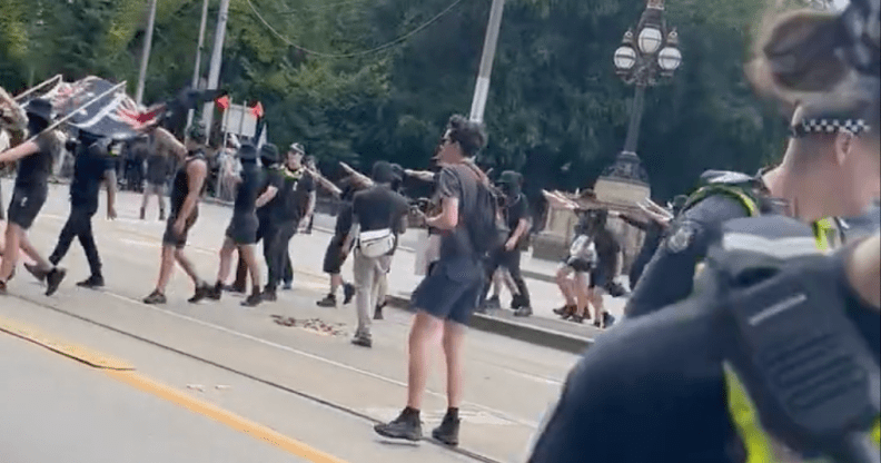 Carrying a banner that read “destroy paedo freaks”, they shouted slurs at LGBT+ activists, chanted “white power” and threw up Nazi salutes.