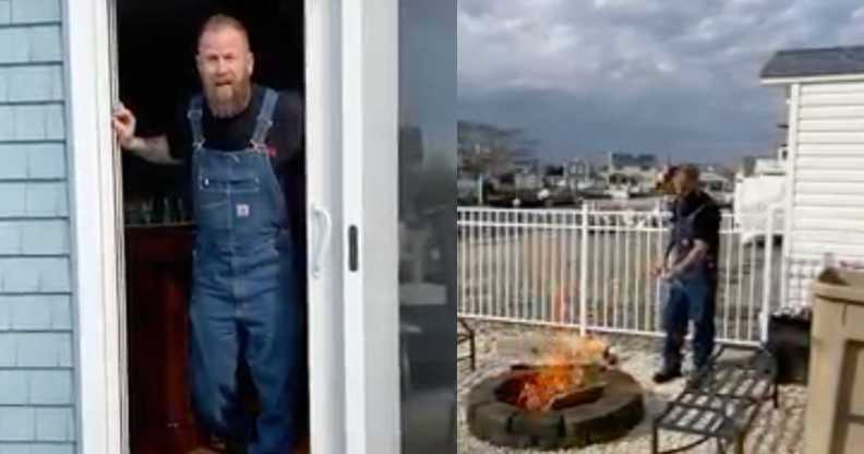 “F**k your woke-ass company,” he says, before setting the fire pit alight and throwing both middle fingers to the camera.
