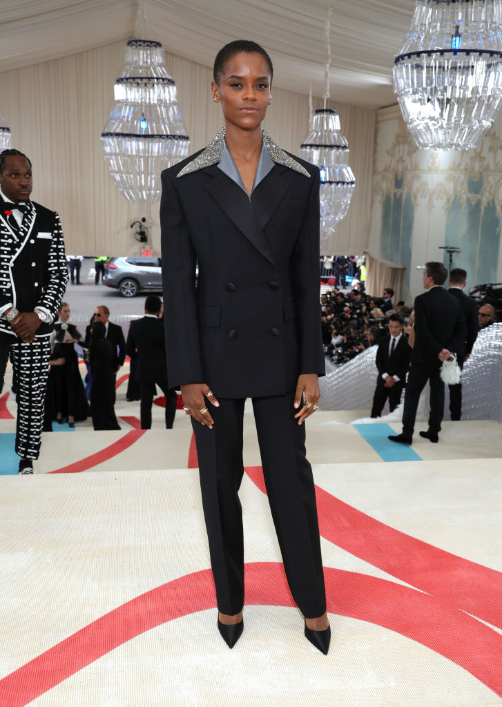 This is how you do a tribute. Even without the massive cape with Lagerfeld’s face on it that takes up the entire carpet, the look is a slay – but it’s literally impossible to ignore.