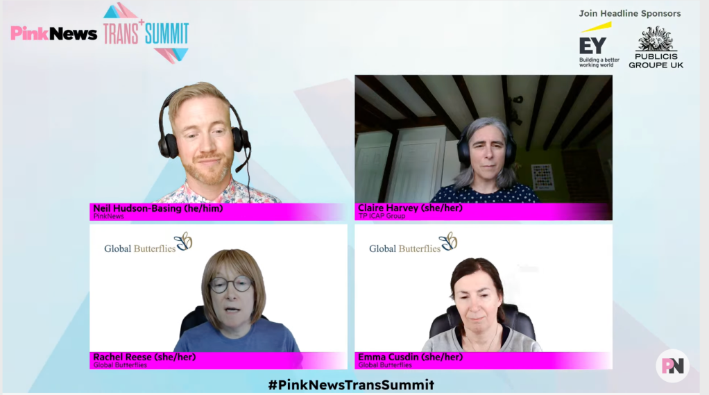 The session was hosted by Neil Hudson-Basing, senior events and communities manager at PinkNews, who was joined by Global Butterflies directors Emma Cusdin and Rachel Reese, along with Claire Harvey, head of inclusion, wellbeing and engagement at TP ICAP.