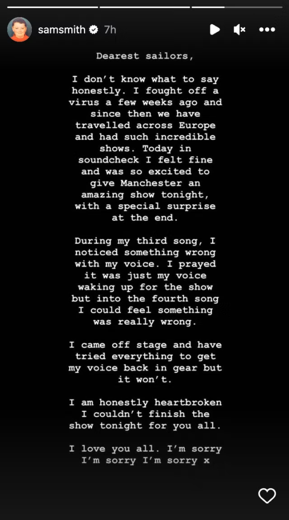 Sam Smith told their fans that although they “came off stage and… tried everything” to recover, their efforts were futile, and followed up by saying they were “honestly heartbroken (they) couldn’t finish the show…”