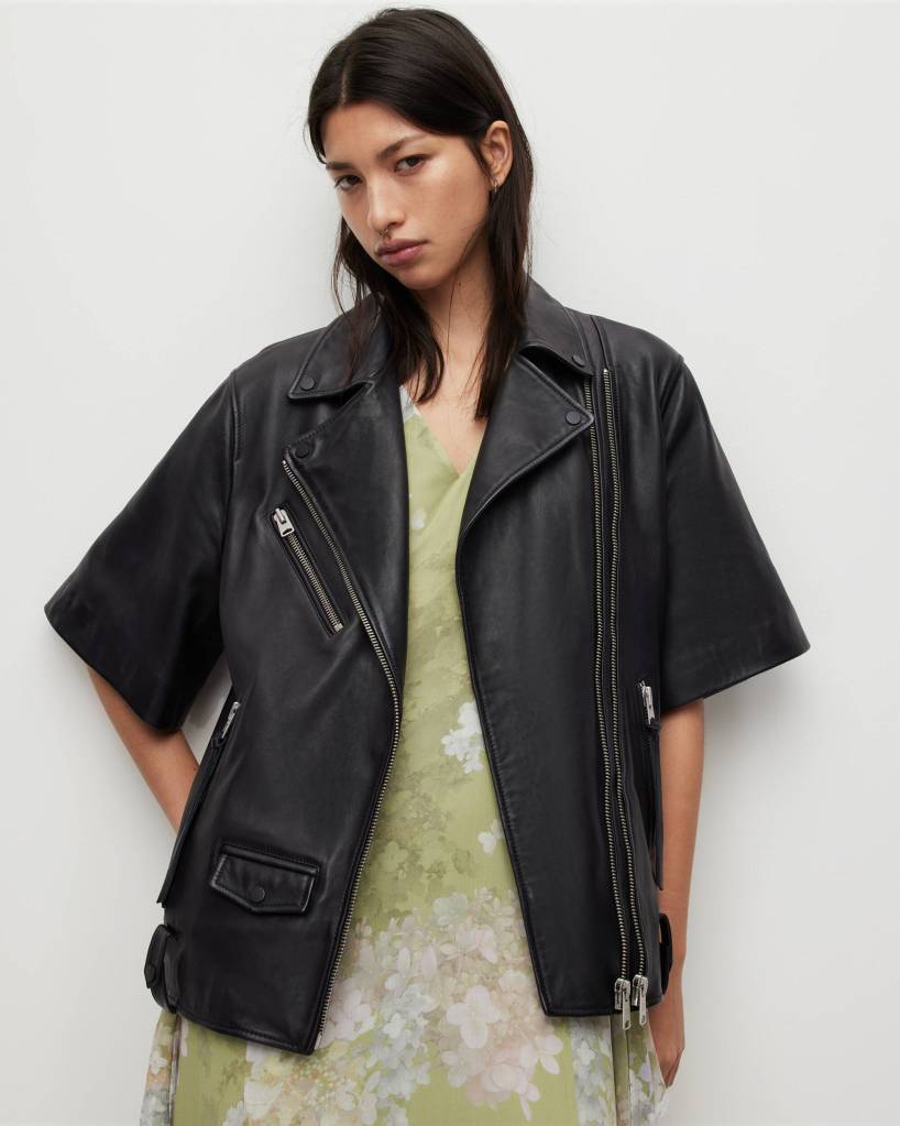 In addition to forever black, AllSaints’ leather jacket collection features a range of summer shades.
