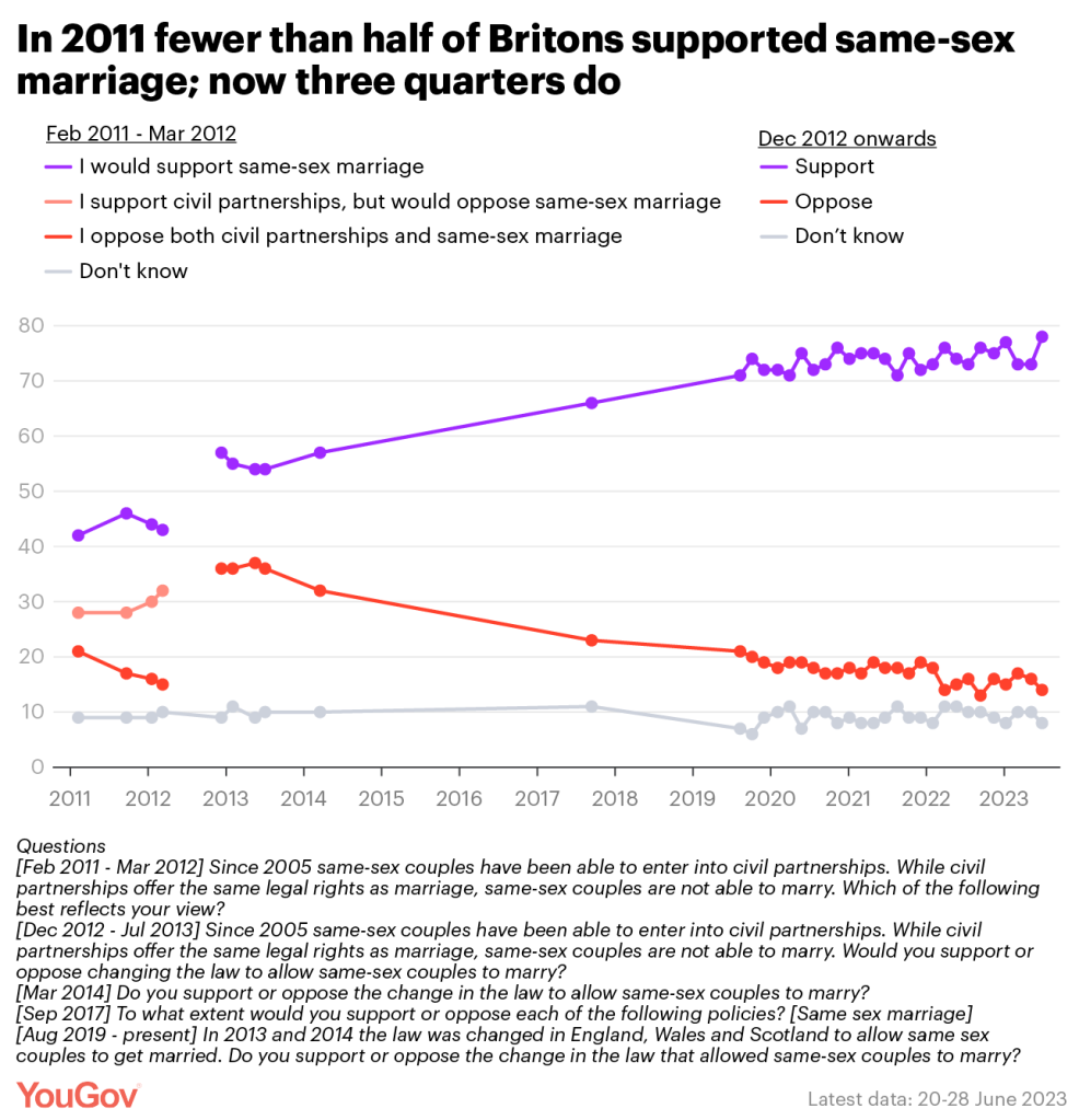 The research shows that 78 per cent of British people now support same-sex unions, the highest figure YouGov has ever recorded.
