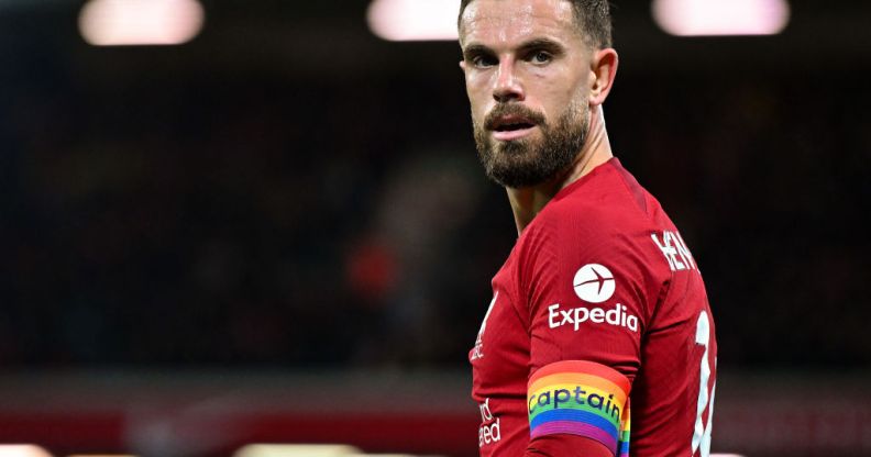 Jordan Henderson captain of Liverpool wearing the rainbow captain armband in support of the LGBTQ+ during the Premier League match between Liverpool FC and Leeds United at Anfield on October 29, 2022 in Liverpool, England. (Photo by Andrew Powell/Liverpool FC via Getty Images)