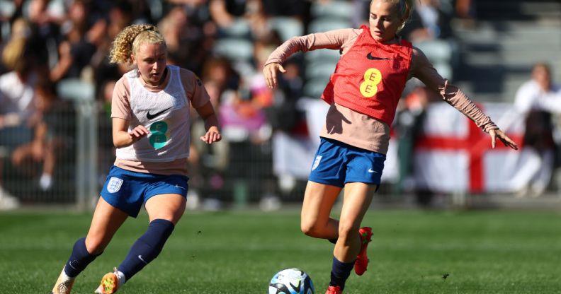 England Lionesses Alex Greenwood and Katie Robinson battle for possession during a training session at Central Coast Stadium on July 25, 2023 in Gosford, Australia. (Photo by Naomi Baker – The FA/The FA via Getty Images)