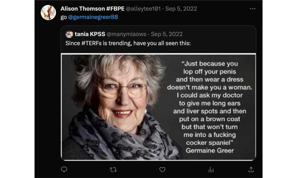 An archive of the posts, curated by an anonymous source, shows Thomson had liked a post which included the hashtag #transwomenareMEN and an offensive quote attributed to feminist Germaine Greer.