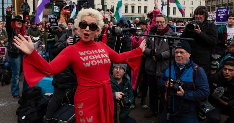 Anti-trans pundit Posie Parker’s latest event in Dublin was drowned out by hundreds of LGBTQ+ protesters and allies. (Getty)