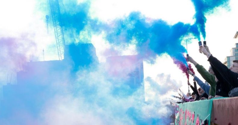 Activists in London let off smoke bombs in the trans flag colours in protest of the government’s treatment of trans people. (Instagram/Vi Dimitrova/T-Boys Club)