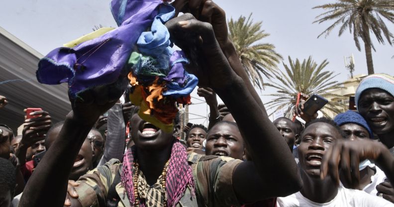 Protestors in Senegal ripping up an LGBTQ+ Pride flag. (Getty)