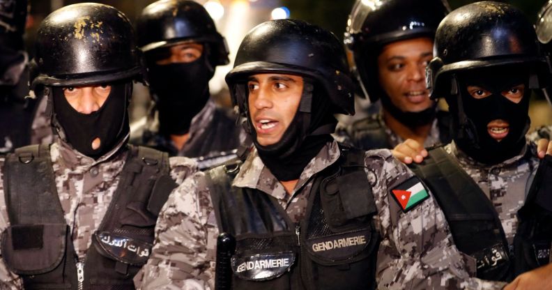 Jordanian anti-riot police facing demonstrators during a protest in 2018. (Getty)