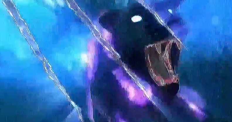 The clip shows a black panther-esque creature, streaked with glowing violet stripes, running through a jungle before snarling and leaping towards the viewer. It scratches through the screen with its claws, to reveal the X logo which is backed by flames.