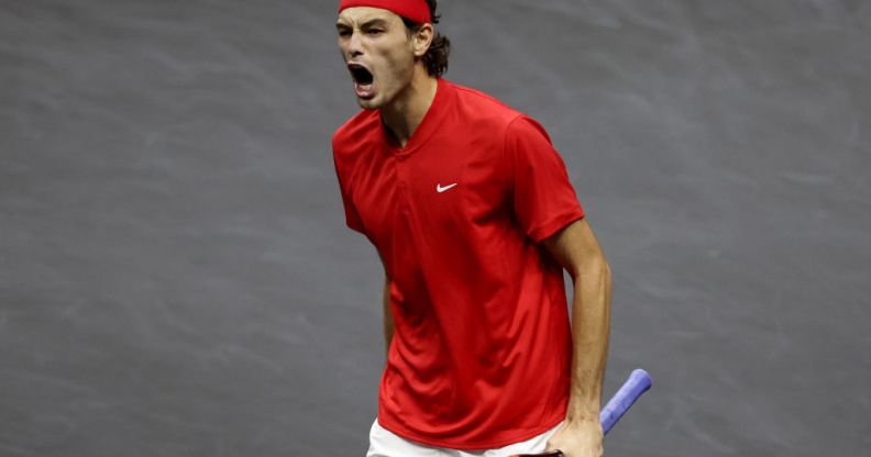 Taylor Fritz of Team World celebrates victory in the singles match between Cameron Norrie of Team Europe and Taylor Fritz of Team World during Day Two of the Laver Cup at The O2 Arena on September 24, 2022 in London, England. (Getty)