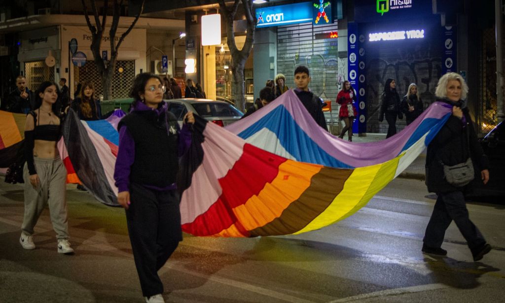 The thousands-strong crowd gathered in Aristotelous Square – the location of the attack – at around 7pm local time on Sunday (10 March), before marching through the streets of the city chanting, waving Pride flags and carrying banners denouncing fascism, homophobia and transphobia.